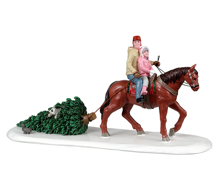 This is the best way to get deep into the forest to find the perfect Christmas tree. The thumping of the hooves and softly falling snow make a magical scene while the father and daughter team look forward to getting home, putting up the tree and decorating it. Hopefully, the little stowaway in the tree hops off at the next stop though, or the family cat may go crazy. (Copyright 2022, 2023, Lemax, Inc.)
