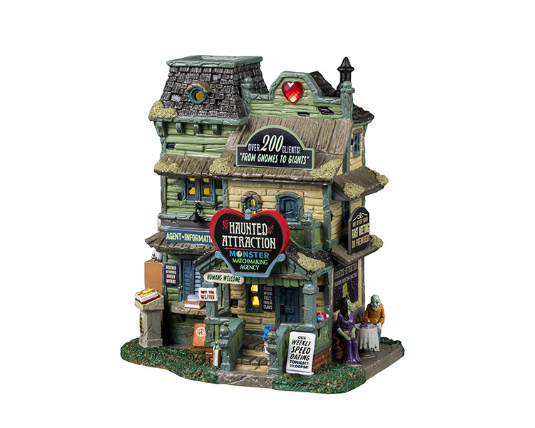Welcome to the Haunted Attraction, an otherworldly matchmaking agency where gnomes, giants, and all kind of creatures join this bizarre quest of love. Nestled of the heart of Spooky Town, this venue attracts hopeless romantics from distant lands to find their creepy half. Leave your expectations at the door and get ready for a match made in hell. Whether you are into speed dating or long first dates, youll be sure to have an eerie story for your grand-kids. (Copyright 2023, 2024, Lemax, Inc.)